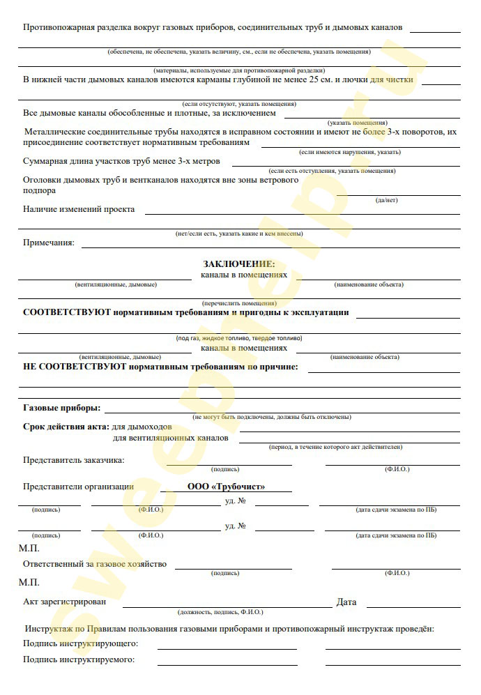 Оформление акта технического состояния дымовых и вентиляционных каналов газифицированного помещения частного дома